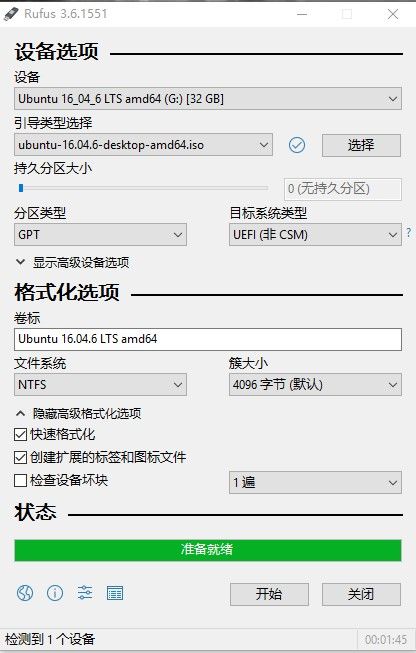 在安装过程中发现使用NTFS格式,电脑识别不到uefi在使用U盘启动时报错“EFI/BOOT/BOOTx64”notfound,但实际上U盘中有这个文件,试了好几次不行Ubuntu16、Ubuntu18、Ubuntu19都不行,估计是rufus的bug如下。只能使用FAT32,簇大小默认即可。